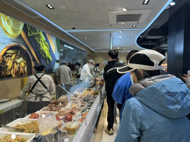 “他们家的红烧鸡腿真是一绝!一荤一素十几块钱就能轻松搞定。”在附近写字楼上班的高女士匆匆赶来,胸前还挂着工牌。她熟练地点完菜后,再盛一碗免费的汤,开始享用午饭。高女士表示,到附近商圈的饭店就餐又贵又费时间,点外卖重盐重油还有不少预制菜,还是来超市吃快餐舒坦,“都是现炒的,价格还很便宜”。