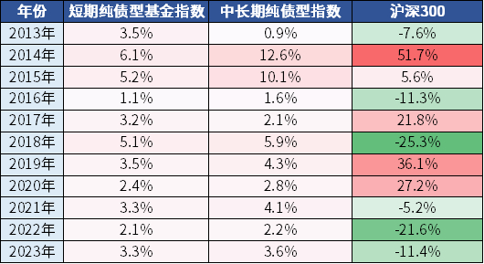数据来源:Wind,采用万得基金指数,2013.01.01-2023.12.31,指数过往业绩走势不代表未来表现,不代表投资建议。