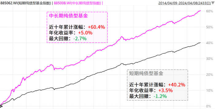 债市在过去十年间已经穿越过多轮牛熊,但我国债市向来“熊短牛长”,无论行情“颠簸几许”,万得短期纯债型基金指数、中长期纯债型基金指数年年正收益。