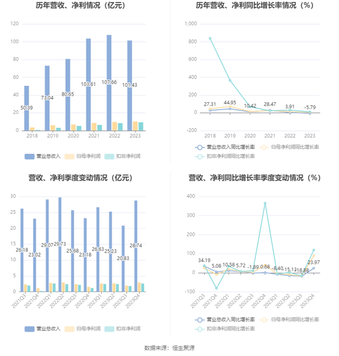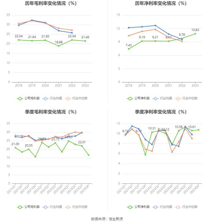 2023年,公司毛利率为21.49%,同比下降0.55个百分点;净利率为10.83%,较上年同期上升1.05个百分点。从单季度指标来看,2023年第四季度公司毛利率为16.68%,同比下降1.87个百分点,环比下降5.33个百分点;净利率为10.76%,较上年同期上升3.00个百分点,较上一季度上升0.15个百分点。