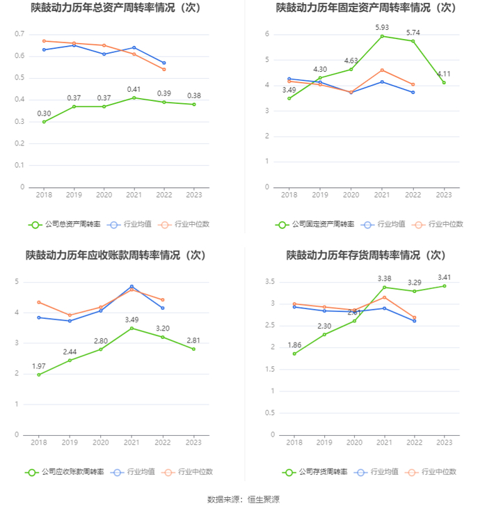 营运能力方面,2023年,公司公司总资产周转率为0.38次,上年同期为0.39次(2022年行业平均值为0.57次,公司位居同行业39/53);固定资产周转率为4.11次,上年同期为5.74次(2022年行业平均值为3.73次,公司位居同行业12/53);公司应收账款周转率、存货周转率分别为2.81次、3.41次。