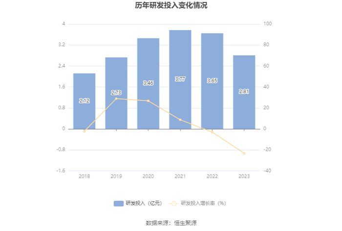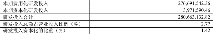 2023年全年,公司研发投入金额为2.81亿元,同比下降23.18%;研发投入占营业收入比例为2.77%,相比上年同期下降0.62个百分点。此外,公司全年研发投入资本化率为1.42%。