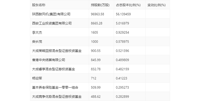 年报显示,2023年年末公司十大流通股东中,新进股东为大成睿享混合型证券投资基金、基本养老保险基金一零零一组合、大成竞争优势混合型证券投资基金,取代了三季度末的富国研究精选灵活配置混合型证券投资基金、新华人寿保险股份有限公司-分红-个人分红-018L-FH002沪、江志烽。在具体持股比例上,陕西鼓风机(集团)有限公司、西安工业投资集团有限公司、李太杰、柴长茂、大成策略回报混合型证券投资基金、香港中央结算有限公司持股有所上升,杨迎军持股有所下降。