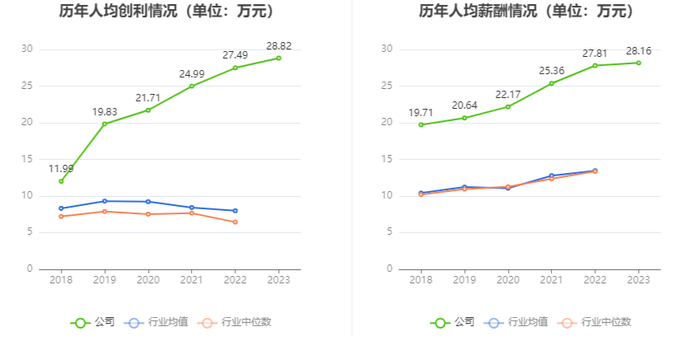 截至2023年末,公司员工总数为3540人,人均创收286.52万元,人均创利28.82万元,人均薪酬28.16万元,较上年同期分别变化-6.24%、4.86%、1.23%。