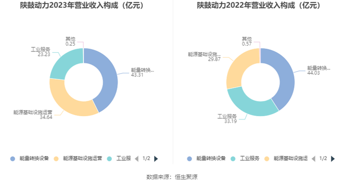 分产品来看,2023年公司主营业务中,能量转换设备收入43.31亿元,同比下降1.63%,占营业收入的42.70%;能源基础设施运营收入34.64亿元,同比增长15.96%,占营业收入的34.15%;工业服务收入23.23亿元,同比下降30.01%,占营业收入的22.90%。