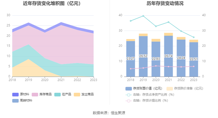 从存货变动来看,截至2023年年末,公司存货账面价值为22.51亿元,占净资产的25.74%,较上年末减少1.73亿元。其中,存货跌价准备为1.62亿元,计提比例为6.7%。