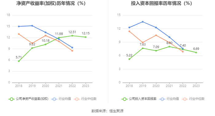 数据显示,2023年公司加权平均净资产收益率为12.15%,较上年同期下降0.36个百分点;公司2023年投入资本回报率为6.69%,较上年同期下降0.71个百分点。
