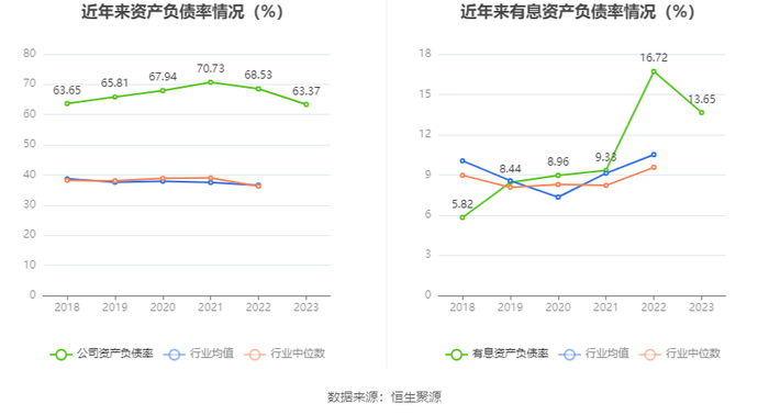 在偿债能力方面,公司2023年年末资产负债率为63.37%,相比上年末下降5.16个百分点;有息资产负债率为13.65%,相比上年末下降3.07个百分点。