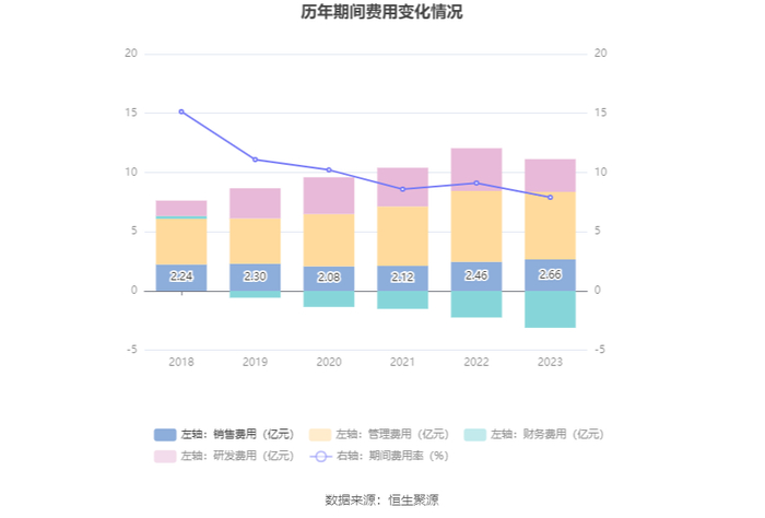2023年,公司期间费用为8.01亿元,较上年同期减少1.80亿元;期间费用率为7.90%,较上年同期下降1.21个百分点。其中,销售费用同比增长8.33%,管理费用同比下降4.81%,研发费用同比下降23.29%,财务费用由去年同期的-2.24亿元变为-3.11亿元。