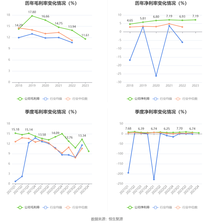 2023年,公司毛利率为11.61%,同比下降2.33个百分点;净利率为7.19%,较上年同期上升0.26个百分点。从单季度指标来看,2023年第四季度公司毛利率为9.75%,同比下降5.26个百分点,环比下降3.59个百分点;净利率为4.59%,较上年同期下降1.92个百分点,较上一季度下降2.15个百分点。