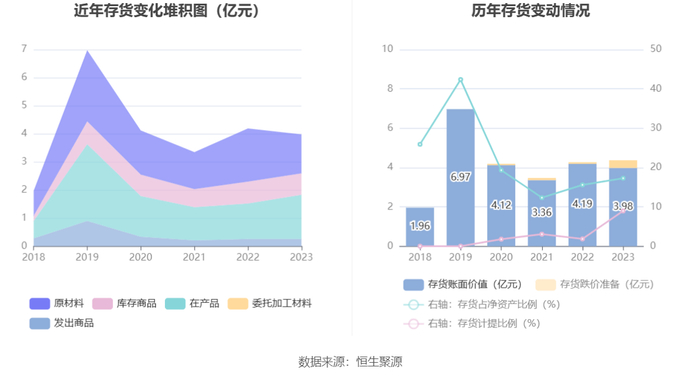 从存货变动来看,截至2023年年末,公司存货账面价值为3.98亿元,占净资产的17.28%,较上年末减少2069.34万元。其中,存货跌价准备为3928.2万元,计提比例为8.97%。
