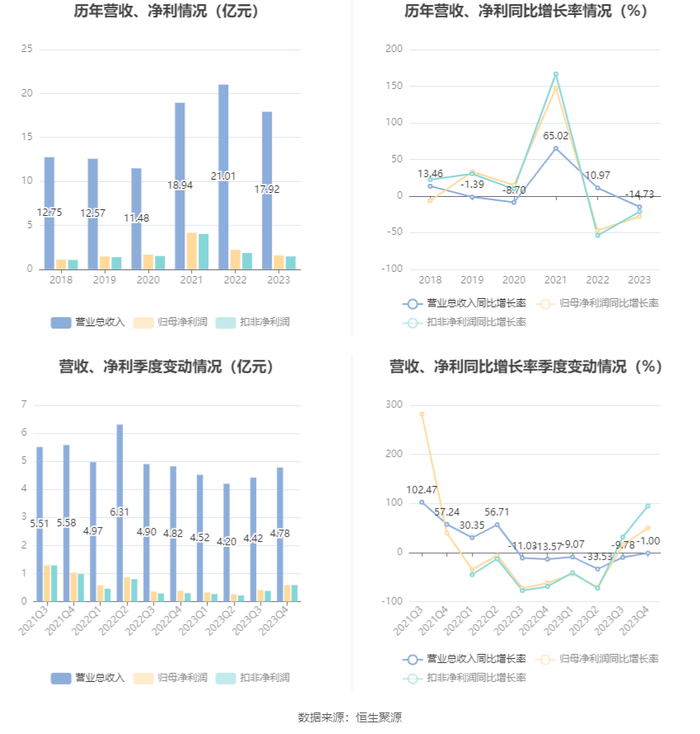 中证智能财讯华尔泰(001217)4月18日披露2023年年报。2023年,公司实现营业总收入17.92亿元,同比下降14.73%;归母净利润1.58亿元,同比下降27.98%;扣非净利润1.46亿元,同比下降21.30%;经营活动产生的现金流量净额为730.01万元,同比下降96.06%;报告期内,华尔泰基本每股收益为0.48元,加权平均净资产收益率为7.42%。