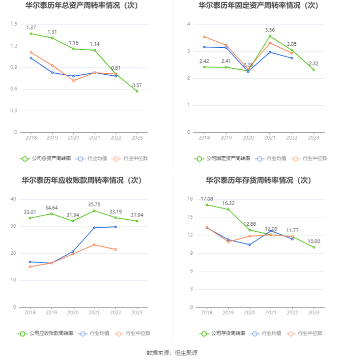 营运能力方面,2023年,公司公司总资产周转率为0.57次,上年同期为0.81次(2022年行业平均值为0.78次,公司位居同行业7/13);固定资产周转率为2.32次,上年同期为3.05次(2022年行业平均值为2.75次,公司位居同行业6/13);公司应收账款周转率、存货周转率分别为31.94次、10.00次。