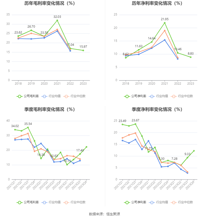 2023年,公司毛利率为15.97%,同比下降1.07个百分点;净利率为8.83%,较上年同期下降1.63个百分点。从单季度指标来看,2023年第四季度公司毛利率为22.27%,同比上升3.75个百分点,环比上升4.87个百分点;净利率为12.26%,较上年同期上升4.16个百分点,较上一季度上升2.93个百分点。