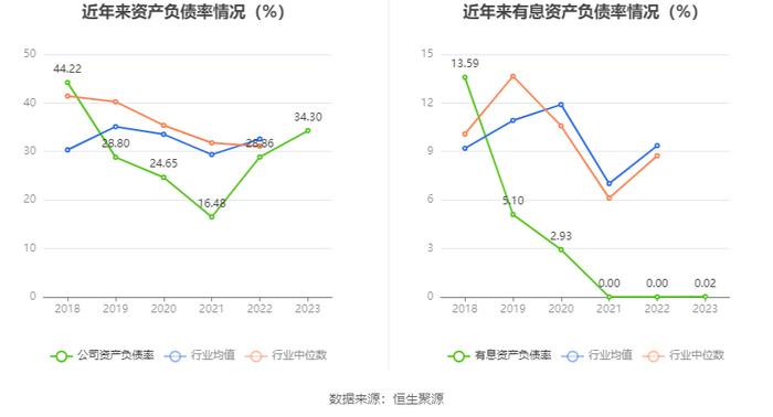 在偿债能力方面,公司2023年年末资产负债率为34.30%,相比上年末上升5.44个百分点;有息资产负债率为0.02%,相比上年末上升0.02个百分点。