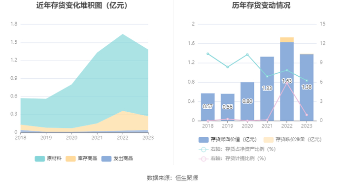 从存货变动来看,截至2023年年末,公司存货账面价值为1.38亿元,占净资产的6.25%,较上年末减少2575.03万元。其中,存货跌价准备为129.84万元,计提比例为0.93%。