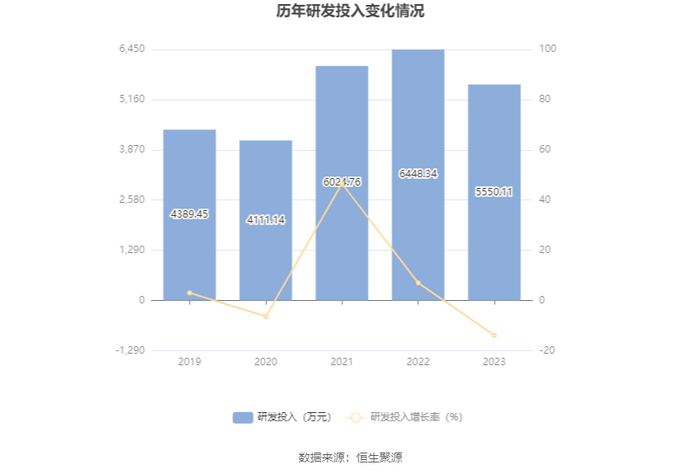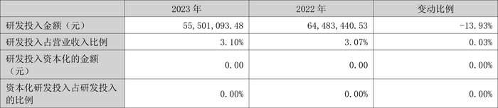 2023年全年,公司研发投入金额为5550.11万元,同比下降13.93%;研发投入占营业收入比例为3.10%,相比上年同期上升0.03个百分点。此外,公司全年研发投入资本化率为0。