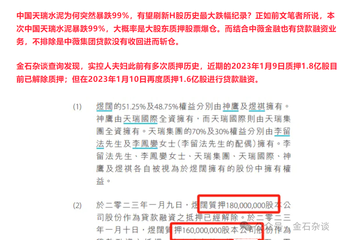此前金石杂谈分析,本次中国天瑞水泥暴跌99%,大概率是大股东质押股票爆仓。金石杂谈查询发现,实控人夫妇此前有多次质押历史,近期的2023年1月9日质押1.8亿股目前已解除质押;但在2023年1月10日再度质押1.6亿股进行贷款融资。