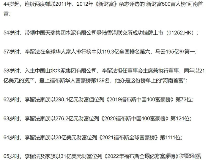 李留法是河南水泥大王,曾是新财富评选的河南首富。在《2024胡润全球富豪榜》中,天瑞水泥的创始人李留法家族财富达275亿元人民币,排名第900位。