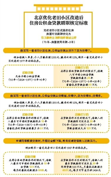 同时,《北京市城市更新条例》第五十四条规定“按照国家规定探索利用住房公积金支持城市更新项目”。为深入实施《北京市城市更新条例》,在首都城市更新中更好发挥住房公积金制度作用,此次中心优化调整老旧小区改造后住房公积金贷款期限核定标准,加大对老旧小区住房的支持力度。