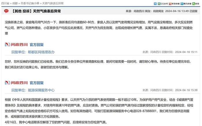 能源保障服务中心则解释称:“根据《中华人民共和国国家计量检定规程》要求,以天然气为介质的燃气表使用期限一般不超过10年。为保护用户用气安全,结合《城镇燃气管理条例》及规程的具体要求,对使用年限满10年的燃气表,应及时更换。燃气公司初装的燃气表均经过国家授权的计量检定机构强制检定,经检定合格在气表上粘贴检定合格标识方可投入使用。如您有其他疑问,可拨打区能源保障服务中心电话028-87888001,我们将为您提供咨询服务,或根据您的需求提供第三方检测服务。4月16日,我中心电话联系您解答了您的燃气问题,后续将安排为您检测气表。”