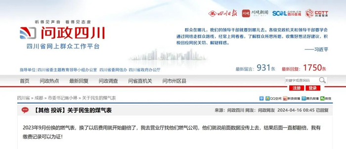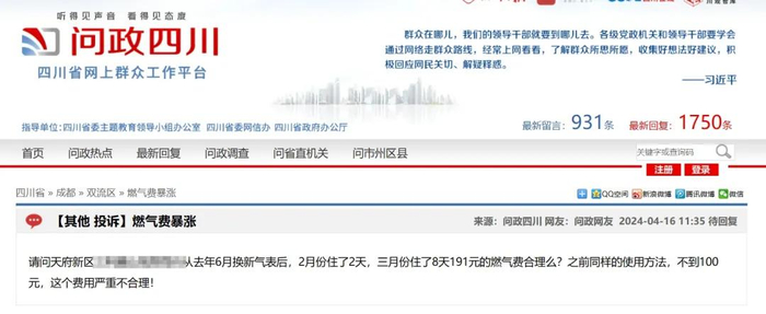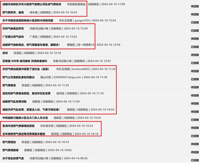 在“问政四川”以“燃气”为关键字搜索,可检索出十多条4月16日发布的反映燃气费相关问题的留言