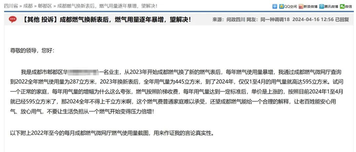 近期,多名成都市居民通过四川省网上群众工作平台“问政四川”反映,自2023年更换燃气表后,出现燃气费用异常上涨现象。