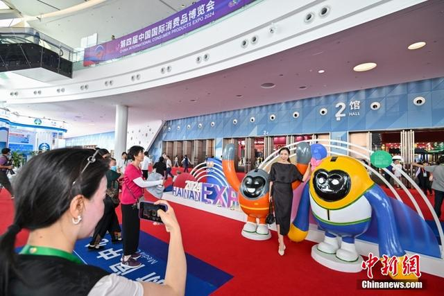 4月17日,海南海口,第四届中国国际消费品博览会迎来社会公众开放日,吸引大批民众前来观展,选购商品。图为民众与消博会吉祥物合影。
