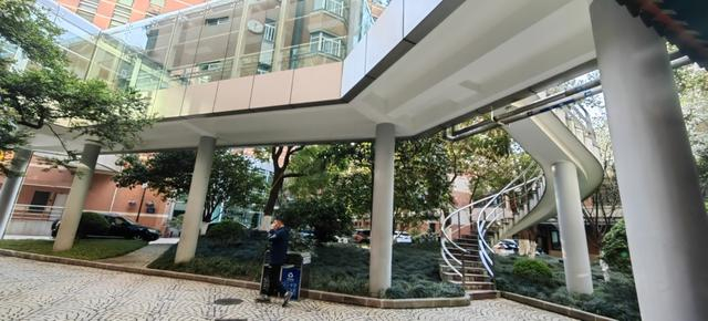 长廊尽头,转向户外,3栋建筑距离较近,但全部由空中连廊连接,其中连廊的一个节点还专设盘旋而下的楼梯,供人中途走到地面。