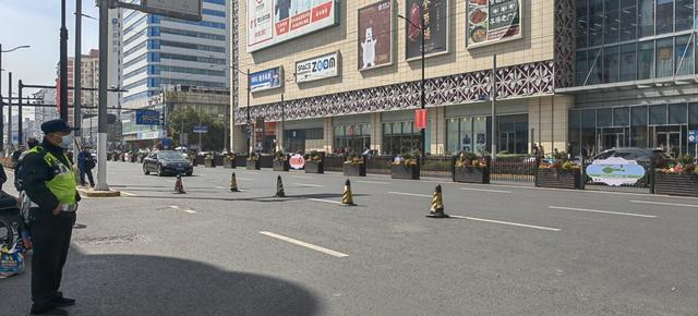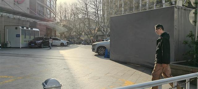 转到宛平南路的大门。宛平南路较为开阔,为单向4车道。因为没有反向机动车,大门口便于管理。医院门口没有特意设置长排路障,也没有多个工作人员守岗,车辆仍然有序流动。