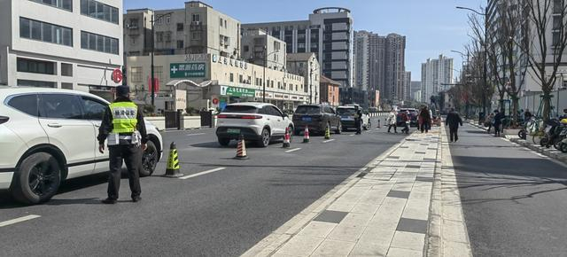 平日里,一个警察在入口、一个警察在出口维持交通秩序。高峰时段,红绿灯处增加警力提前疏导。