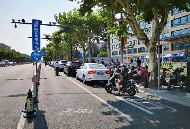 值得一提的是,江浦路用作排队的右车道,实际上没有紧挨着医院大门,机动车道与大门之间还隔着厚厚的绿化带和非机动车道。也就是机动车与骑行者,很可能发生路线冲突。