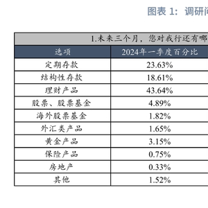 调研结果:资产需求方面,定期存款需求明显下降,理财产品和黄金的配置需求显著提升,房地产投资需求持续下降。收益与预期方面,取得负收益的客户较上季度有所增加,而客户对股票市场的预期有所好转。投资习惯方面,客户对基金产品比较看重历史收益及排名,在收益较好时,客户的增持意愿会更强。