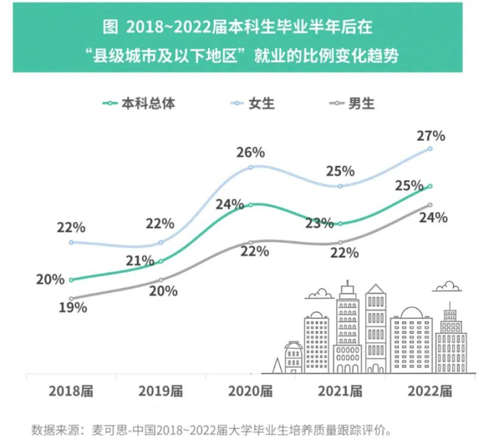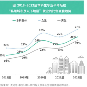 据麦可思研究院近期发布的《中国2018—2022届大学毕业生培养质量跟踪评价蓝皮书》显示,近几年大学生就业重心持续下沉,越来越多本科毕业生选择到“县级城市及以下地区”(下称“县城”)这类小城市就业。