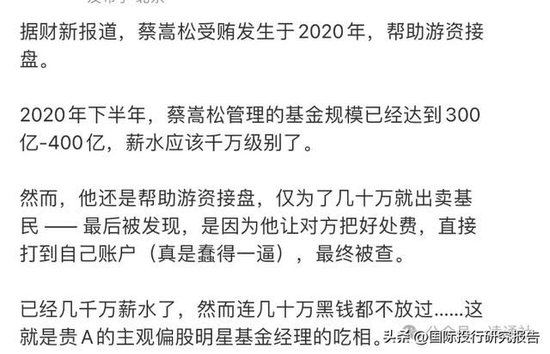 财新报道,在小圈子一直有传闻,2020年前后,曲泉儒把这个票的操作办法和好处介绍给了蔡嵩松,两人分别用自己管的不同产品持有了相关小票约小半年,总共1000万元左右。两人胆子较大直接让对方把好处费转给了自己账户,曲泉儒收了约百万元,蔡嵩松收了几十万元。另外,董博雄恐怕在中间充当了掮客的角色。