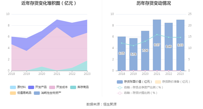 从存货变动来看,截至2023年年末,公司存货账面价值为9.03亿元,占净资产的14.77%,较上年末增加5371.77万元。其中,存货跌价准备为60.63万元,计提比例为0.07%。