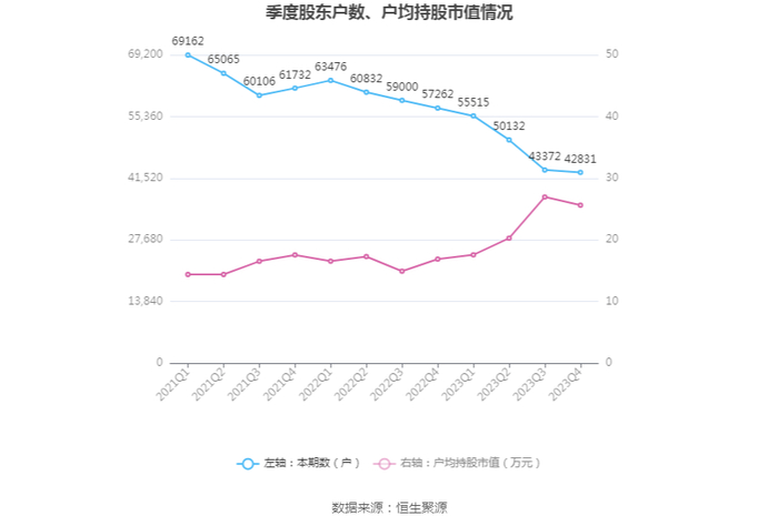 筹码集中度方面,截至2023年年末,公司股东总户数为4.28万户,较三季度末下降了541户,降幅1.25%;户均持股市值由三季度末的26.96万元下降至25.63万元,降幅为4.93%。
