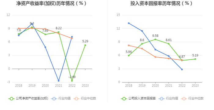 数据显示,2023年公司加权平均净资产收益率为5.29%,较上年同期增长7.98个百分点;公司2023年投入资本回报率为5.19%,较上年同期增长0.32个百分点。