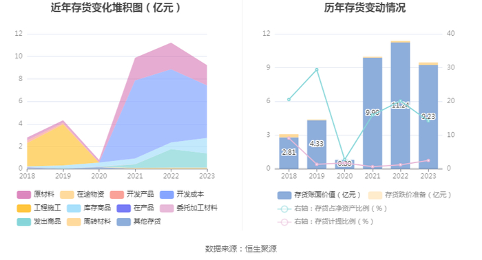 从存货变动来看,截至2023年年末,公司存货账面价值为9.23亿元,占净资产的14.23%,较上年末减少2.0亿元。其中,存货跌价准备为2365.73万元,计提比例为2.5%。