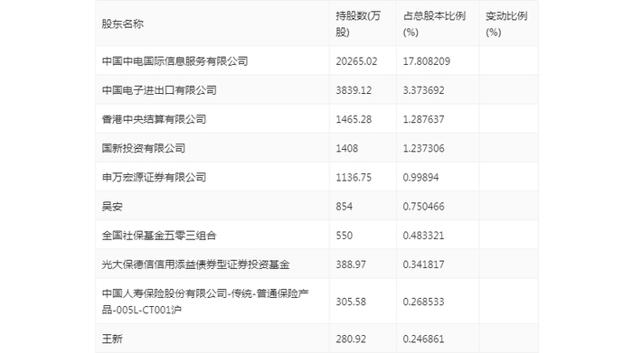 年报显示,2023年年末公司十大流通股东中,新进股东为吴安、中国人寿保险股份有限公司-传统-普通保险产品-005L-CT001沪、王新,取代了三季度末的诺安积极回报灵活配置混合型证券投资基金、基本养老保险基金一二零二组合、广发中证基建工程交易型开放式指数证券投资基金。在具体持股比例上,国新投资有限公司、申万宏源证券有限公司持股有所上升,香港中央结算有限公司、光大保德信信用添益债券型证券投资基金持股有所下降。