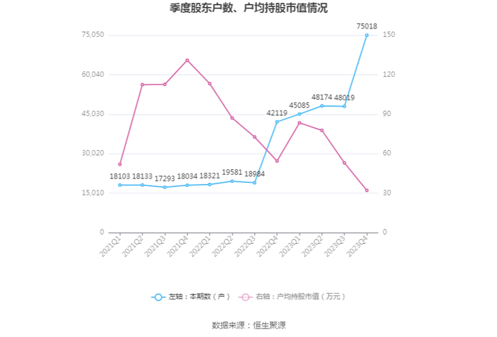 筹码集中度方面,截至2023年年末,公司股东总户数为7.5万户,较三季度末增长了2.7万户,增幅56.23%;户均持股市值由三季度末的53.04万元下降至32.13万元,降幅为39.42%。