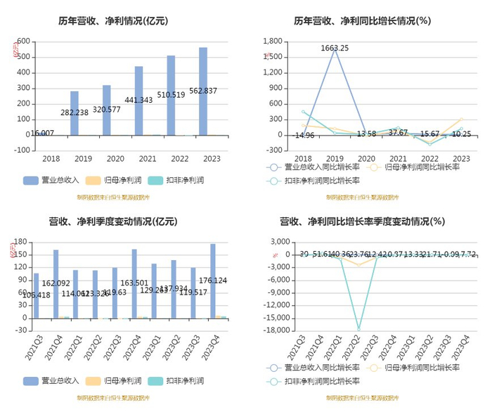 2023年,公司毛利率为11.28%,同比下降0.13个百分点;净利率为1.55%,较上年同期上升0.14个百分点。从单季度指标来看,2023年第四季度公司毛利率为12.38%,同比下降0.99个百分点,环比上升1.33个百分点;净利率为4.72%,较上年同期上升0.62个百分点,较上一季度上升5.30个百分点。