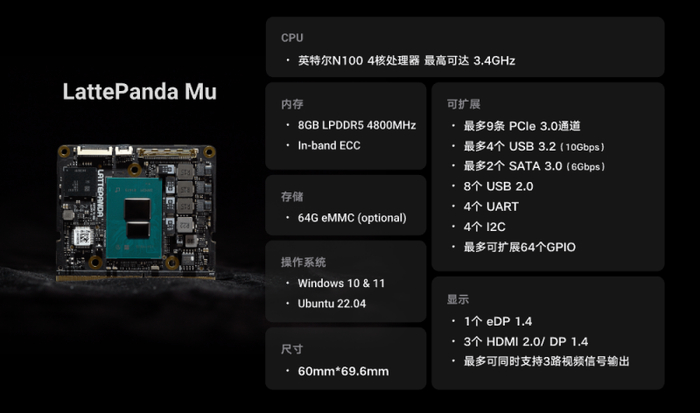 2024年4月19日,LattePanda(拿铁熊猫)团队在国内平台正式发售LattePanda Mu,一款微型x86计算模块,旨在迅速赋能定制设计解决方案。LattePanda Mu搭载英特尔N100 CPU,与Windows和Linux操作系统兼容。在CPU性能上优于Raspberry Pi 5,在 GPU 性能上也强于多种传统开发版的GPU。LattePanda Mu尺寸紧凑仅为60mm x 69.6mm,具有260引脚SO-DIMM边缘连接器,默认配置8GB RAM和64GB eMMC闪存,其金手指有多种外设接口(如 PCIe、USB、HDMI),LattePanda Mu能够无缝整合到各种应用中,包括物联网、机器人、数字标牌和边缘计算,确保在各种场景中高效处理任务和极强的可靠性。