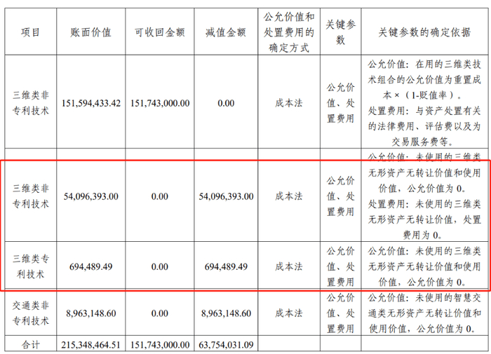 对此,深交所在问询函中指出,上述项目的取得时间、取得方式、入账价值及依据、摊销方法、以前年度摊销情况、减值测试的计算方法、选取的参数及假设等。并结合三维类技术组合的构成内容、组合确认方式、以前年度组合构成及变化情况等,说明你公司认为上述无形资产无转让价值和使用价值的原因,相关减值迹象的发生时间节点及依据。
