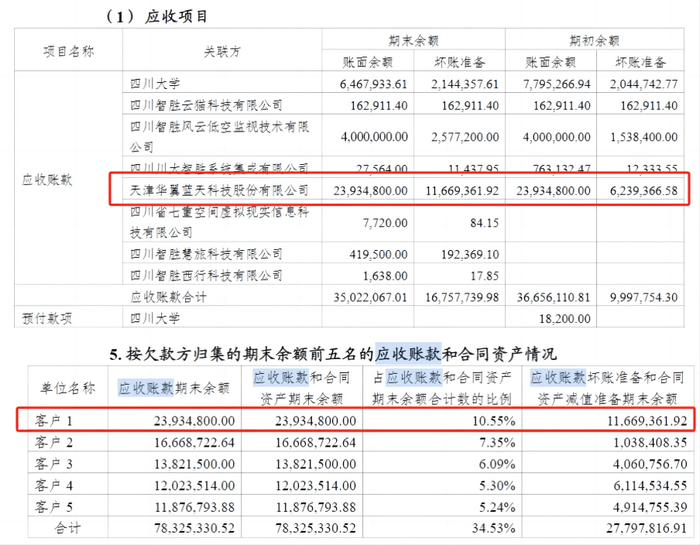 在这些应收款项中,存在关联方的款项。2023年,川大智胜对联营企业天津华翼蓝天科技股份有限公司(以下简称“华翼蓝天”)应收款项为2,393.48万元,为公司第一大欠款方,占应收账款和合同资产比重为10.55%,计提坏账准备1,166.94万元。