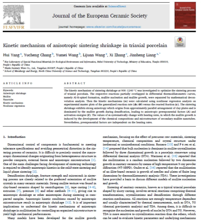 在全球卫浴行业的激烈竞争中,惠达卫浴与河北工业大学合作的卫生陶瓷烧结技术项目研究取得了显著成果。凭借前瞻性的科技视野和卓越的科研实力,惠达卫浴成功实现了陶瓷烧结技术的突破。由惠达卫浴陶瓷生产中心先进材料研究部高级经理杨晖担任第一作者的论文《传统三元陶瓷各向异性烧结收缩的动力学机制——Kineticmechanism of anisotropic sintering shrinkage in triaxialporcelain》已在国际陶瓷领域权威学术顶刊《Journalof the European CeramicSociety》发表。这是国内建筑卫生陶瓷企业首次在该期刊发表学术论文,这一成就不仅凸显了惠达卫浴在国内陶瓷研发领域的领先地位,更向世界展示了中国卫浴科技的强大实力。
