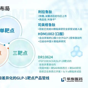 在过去的2023年,华东医药的GLP-1靶点药物“利鲁平”分别获批上市用于治疗成人2型糖尿病、肥胖或体重超重,该药是国内首个获批上市的利拉鲁肽生物类似药。利鲁平也成为国内首个获批用于减肥的GLP-1靶点药物。