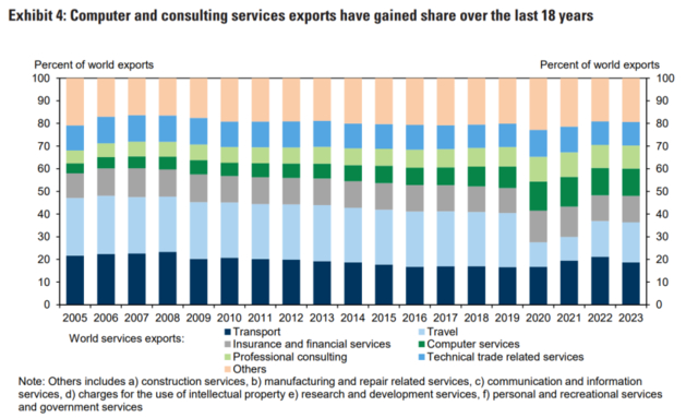 2005年至2023年,计算机服务和咨询服务的出口分别增长了7倍和4.7倍,到2023年分别占全球服务出口的12%和10%,而在2005年时这一比例分别为4.4%和5.7%。