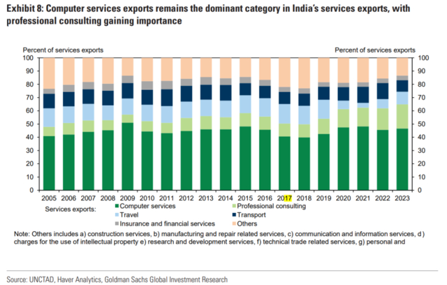 高盛亚洲经济分析师Santanu Sengupta及其团队在一份最新研究报告中指出,伴随全球贸易重心向计算机和咨询等服务领域加速转移,印度服务出口产业迎来蓬勃发展的黄金机遇期。
