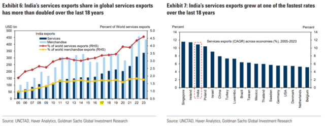 高盛指出,自2005年以来,印度服务出口以接近11%的年复合增长率增长,远超全球增速,特别是在计算机和专业咨询服务方面。到2023年,印度在全球服务出口中的份额从不足2%增至4.6%。